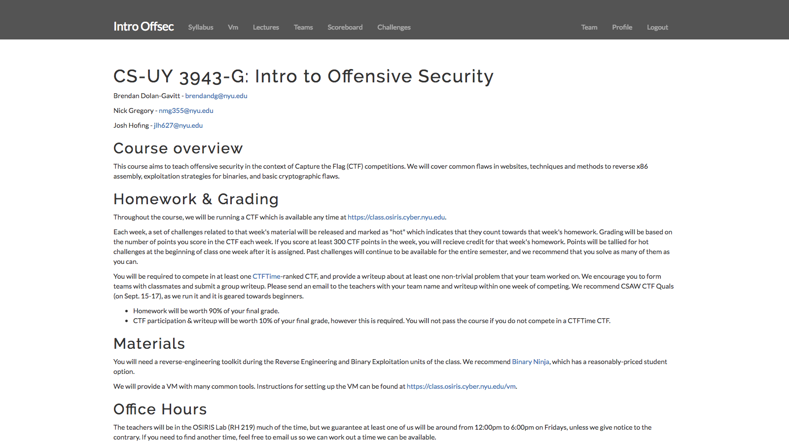 Nick Gregory and Josh Hofing are students in the OSIRIS Lab at NYU Tandon School of Engineering. Knowing how valuable a learning experience Capture the Flag (CTF) security competitions can be, they approached professor Brendan Dolan-Gavitt with a pitch to bring an offensive security class to NYU, organized as a CTF. It would be up to them to develop coursework, deliver lectures, and grade assignments while complying with relevant law and school policy. Dolan-Gavitt approved. They named their class Introduction to Offensive Security, and turned to CTFd to make it happen.